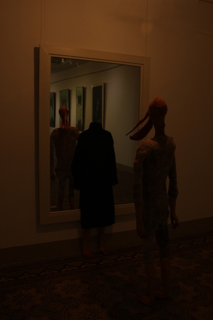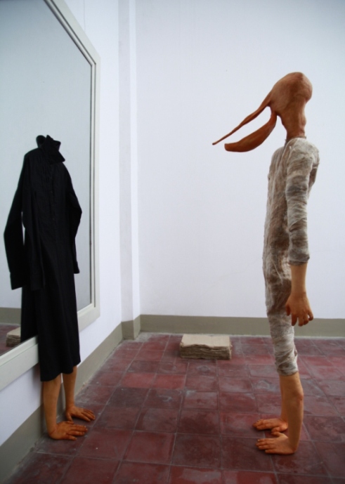 Điêu khắc sắp đặt của Nguyễn Thúy Hằng. Phần cánh tay của tác phẩm được đúc khuôn từ người thật (của chính tác giả). Người: 155cm; Gương: 120cm x 170cm. Sắt, vải, composite. Sáng tác: 2012. Nằm trong triển lãm nhóm nữ “The Walker,” Bảo Tàng Mỹ Thuật, Sài Gòn, 30.03 đến 7.04.2012.