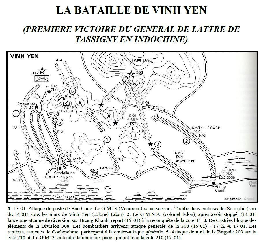 — Cái hôm ấy mà tay de Lattre không đích thân xuống Vĩnh Yên nắm quyền chỉ huy mặt trận là tiêu cả. Nhà cụ thân sinh tôi bên khu Thanh Giã bị pháo nát, trông thấy lính Bắc-Phi chúng nó hoảng loạn hết cả… Cái tay Giáp thế mà dại, cứ tấn vào Vĩnh Yên ngay cái đêm đồn Bảo Chúc thất thủ là đã bắt sống Vanuxem. De Lattre bị bất ngờ, Giáp đánh nghi binh vào Lục Nam, rồi Đông Triều, tay mật thám Boussary cứ tưởng đánh Hải Phòng, bao nhiêu quân dự bị đưa hết ra đấy. De Lattre tung cả thiết đoàn của Beauffre lên hết mạn bắc Hà Nội để giữ Cẩm Lý, không ngờ Giáp đánh Vĩnh Yên… Chả có cái dại nào bằng đã điệu hổ ly sơn rồi lại đợi con hổ quay lại. Giáp cứ vây không đánh, đợi đến khi de Lattre huy động toàn binh lực, lập cả cầu không vận đưa 5 tiểu đoàn từ Sàigòn ra thì hỏng cả. Cái trận Vĩnh Yên là tôi thấy Giáp bất tài, cứ áp dụng cứng nhắc binh pháp của Tàu là công đồn đả viện. Mình phải biết ứng biến chứ! Chẳng qua thắng Điện Biên Phủ là do Navarre kém, chứ không phải Giáp giỏi.